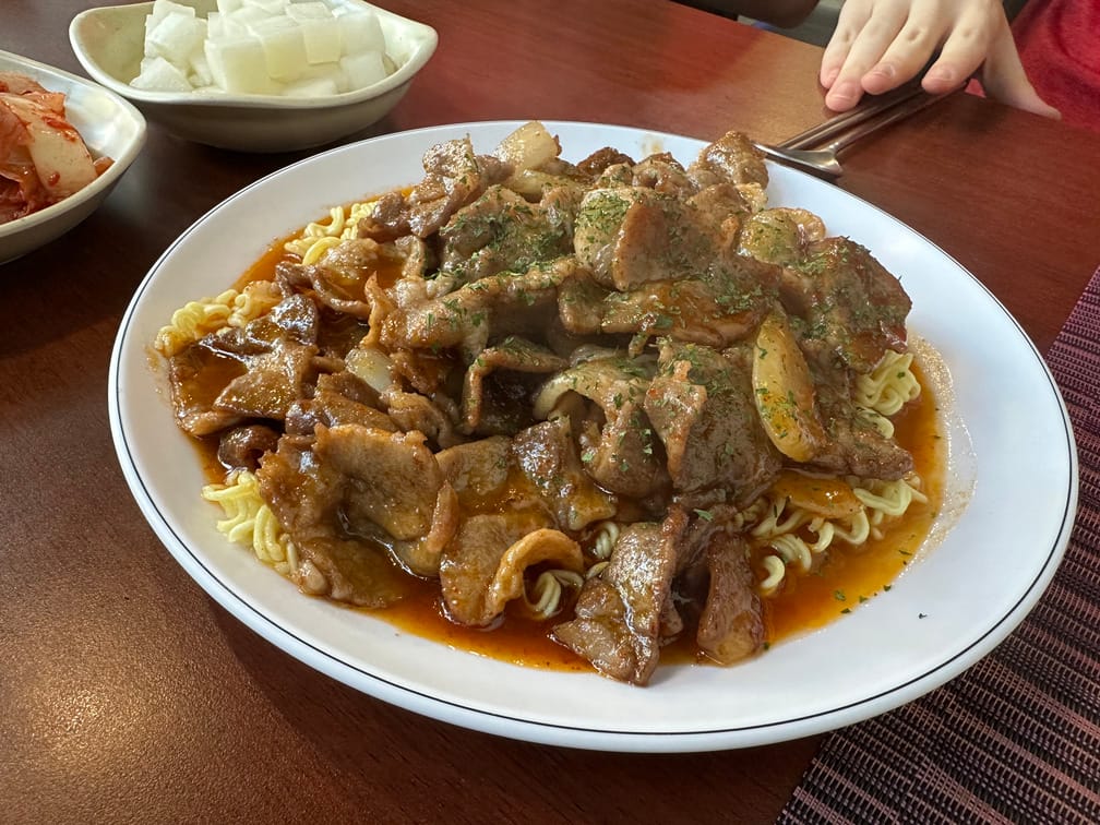 사진에서 볼 수 있는 것처럼 삼겹살을 양념에 졸여 굽고, 라면 면을 함께 먹는 맥주 술안주와도 같은 메뉴입니다. 이전에 갔을 때에는 닭 소금구이 메뉴가 있었는데 그건 없어지고 제육볶음같은 고기가 들어간 메뉴가 새로 올라와 있어서 먹었습니다. 정확한 메뉴 이름은 기억나지 않고 검색되지 않는데, 양념삼겹살구이의 염가 버전이라고 생각하게 되었습니다.