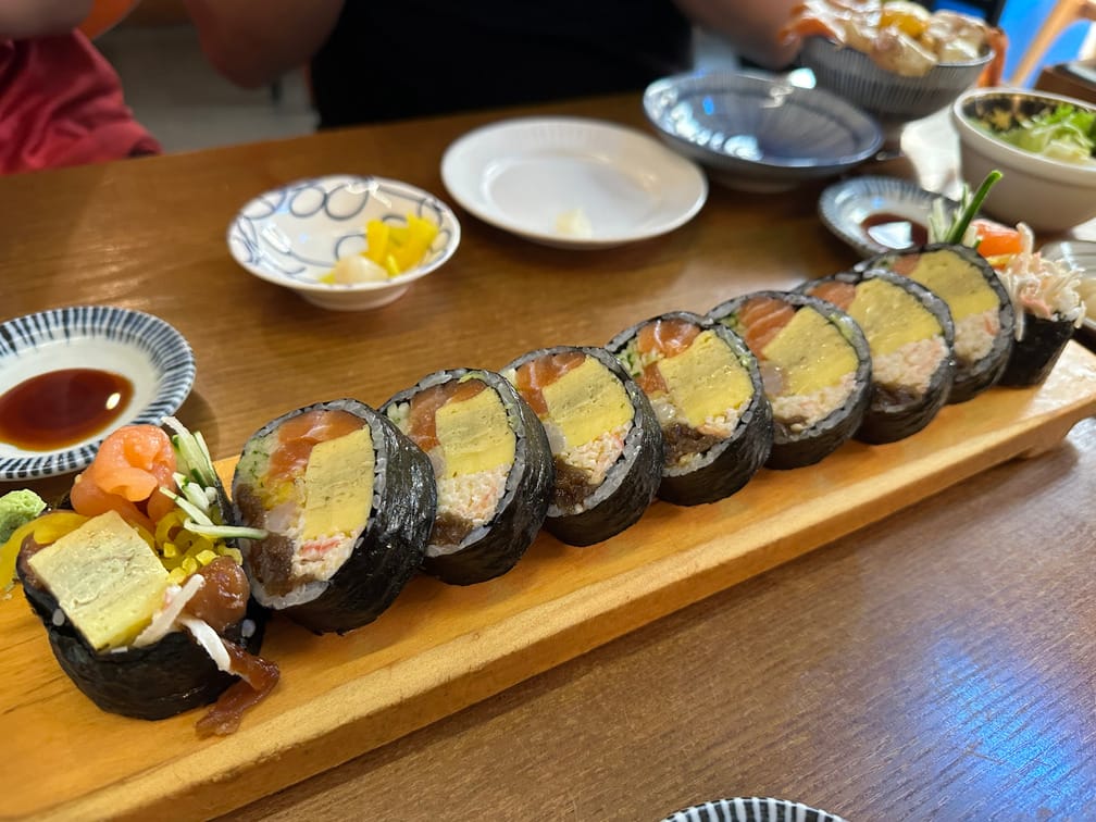야끼돈부리는 토치로 겉면을 익힌 새우, 관자, 연어 등이 올라간 덮밥이었는데 맛있었습니다. 양은 많은 편이 아니지만 우동이 함께 나와서 포만감은 적당히 채워지는 편이었습니다. 연어가 들어간 김밥도 맛있었습니다.