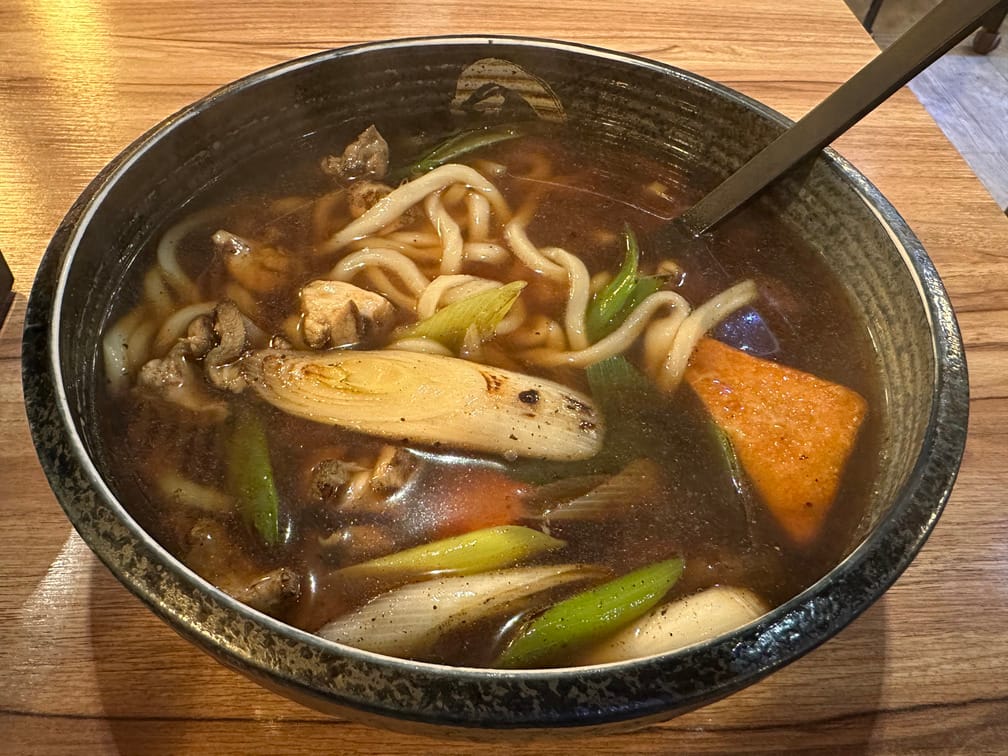 넓은 면기에 우동이 차려져 있다. 국물은 진하고, 유부, 구운 대파, 닭고기 등이 어지럽게 들어가 있다.