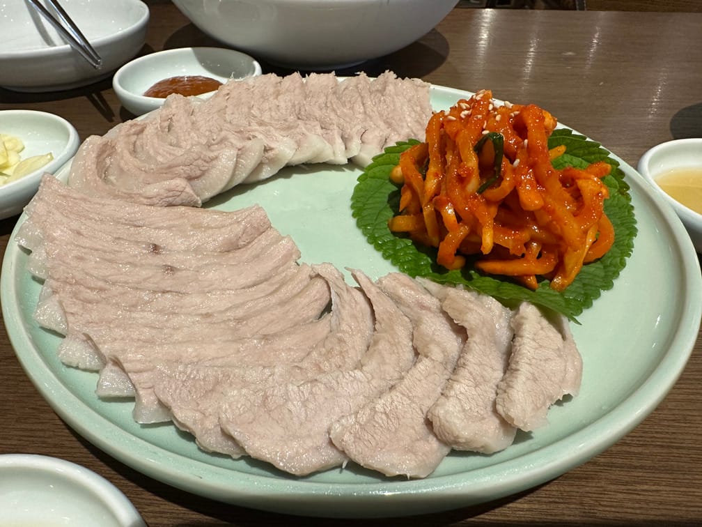 항정 수육은 말 그대로 항정살을 사용한 수육인데 곁들여 나오는 무채와 새우젓, 혹은 고추간장에 곁들여먹는 것이 맛있었습니다. 이 가게는 수육에 곁들이는 무채, 밑반찬으로 나오는 흰 무채와 고춧가루 무채가 모두 다른데, 정말 주방 한 켠에서 끊임없이 무가 썰리고 있겠다는 상상을 하게 됩니다.