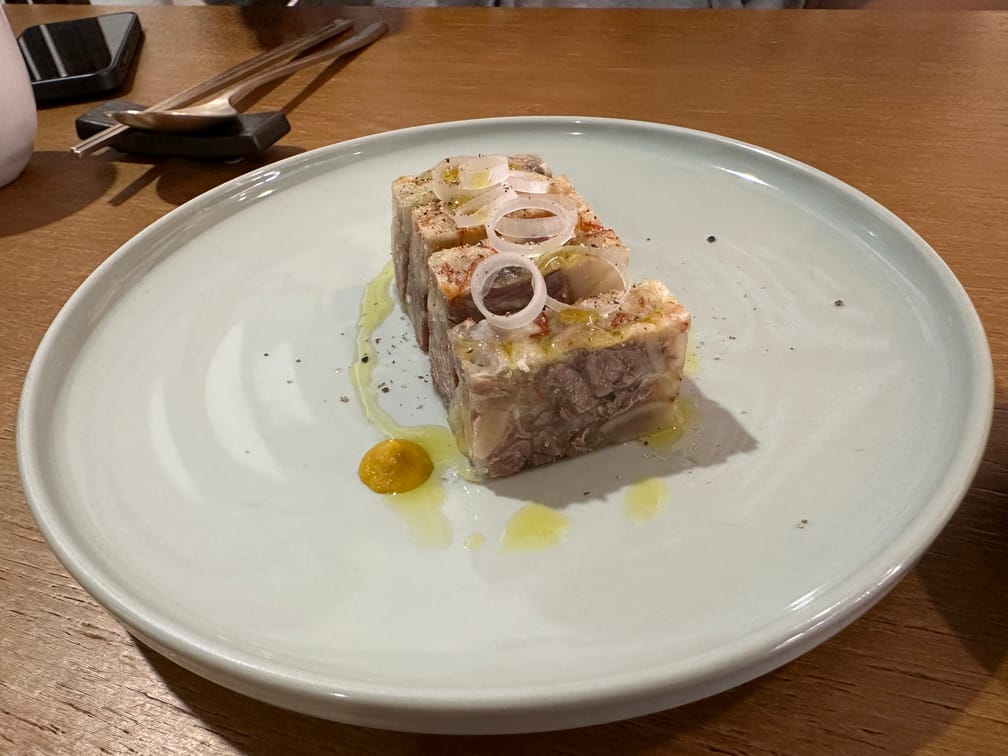족편은 찾아보니 원래 있는 전통 음식이라고 하네요. 자체에 어떤 맛이 느껴진다기보다는 식감 위주이고, 같이 올라온 겨자와 함께 먹으면 괜찮은 음식이었습니다. 대충 이 가격에 파인다이닝처럼 꾸며진 음식을 먹는 거 싫어하진 않습니다. 다음에 갔을 때 (다시) 시킬까? 는 잘 모르겠습니다.